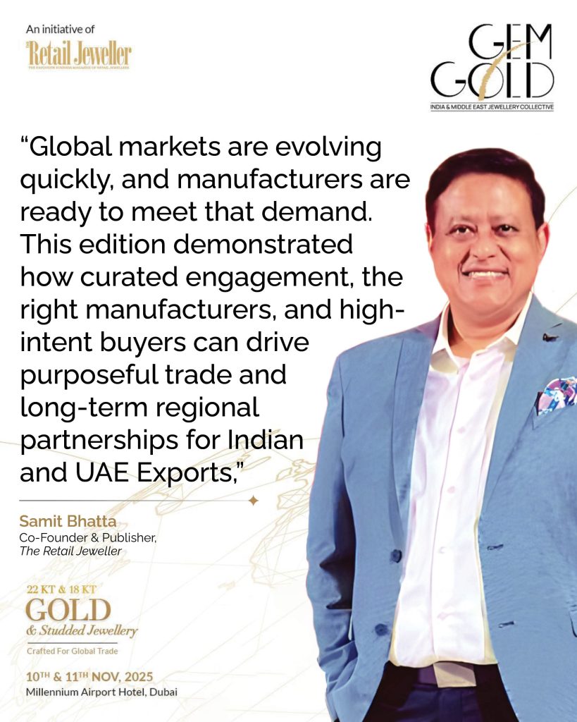 “Global markets are evolving quickly, and manufacturers are ready to meet that demand. This edition of GemGold demonstrated how curated engagement, the right manufacturers and high-intent buyers can drive purposeful trade and long-term regional partnerships for Indian and UAE Exports,” said Samit Bhatta, Co-Founder & Publisher, The Retail Jeweller.