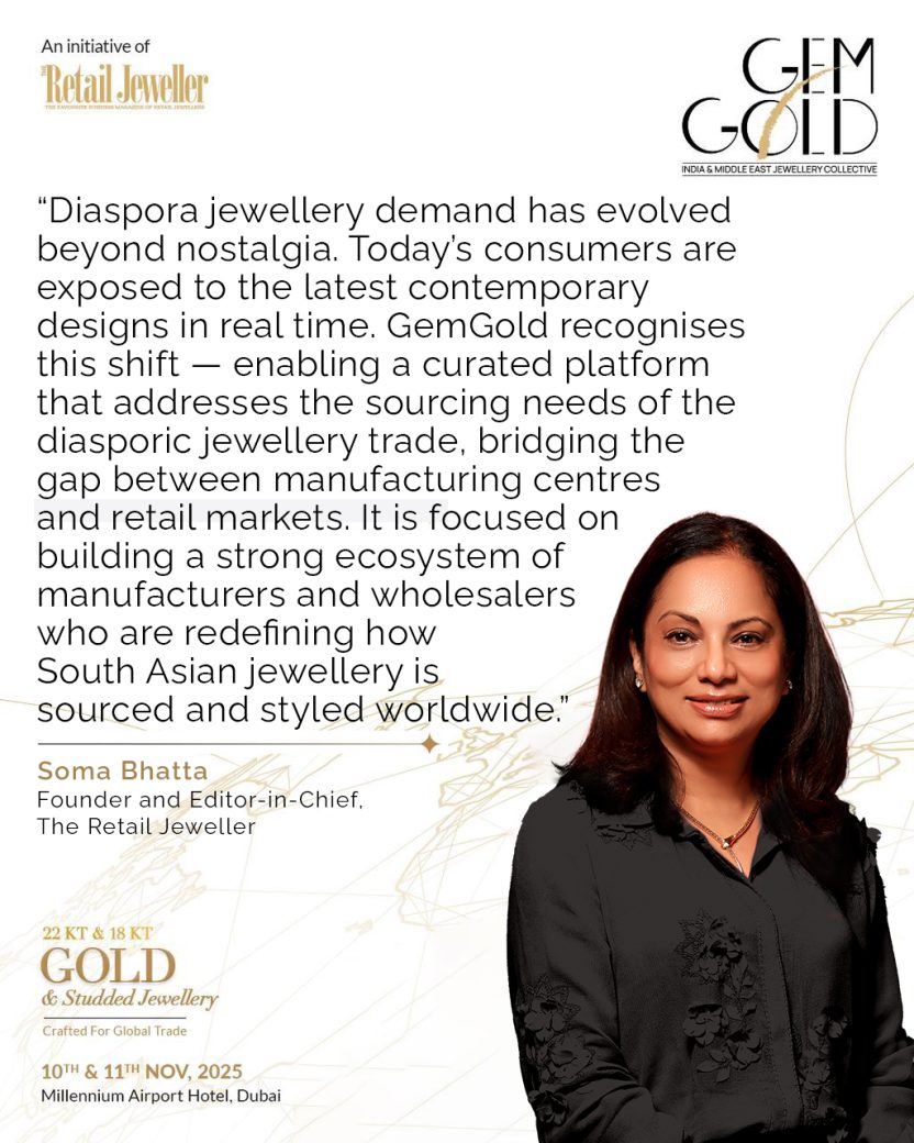 “Diaspora jewellery demand has evolved beyond nostalgia. Today’s consumers are exposed to the latest contemporary designs real time. GemGold recognises this shift — enabling a curated platform that addresses the sourcing needs of the diasporic jewellery trade, bridging the gap between manufacturing centres and retail markets. It is focused on building a strong ecosystem of manufacturers and wholesalers who are redefining how South Asian jewellery is sourced and styled worldwide,” said Soma Bhatta, Founder and Editor-in-Chief, The Retail Jeweller.