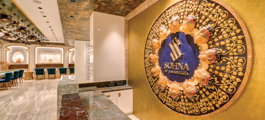 Picture a space measuring 6000sq ft. cut out from the existing 45000sq ft show room and redesigned exclusively for Sohna by Sawansukha. The entire look and feel of this area resonates the essence of the name that signifies the metal gold. Glittering hues of molten gold engulf the entire ambience. The store design reinvents the adage, ‘the devil in the details’. Be it the logo, the wall décor, minimal chandeliers, design elements, to the broad golden doors-everything vouches for meticulous planning that took almost 8 months to transform into a visual reality.
