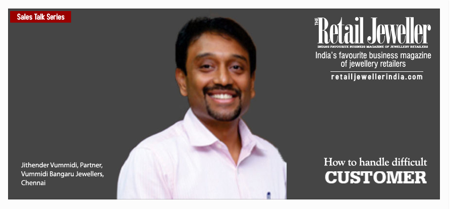 Once a young couple was looking at a pair of diamond bangles in the showroom. They were trying on different pairs. It so happened that one of our salesman took away the mirror, which was in front of them, without informing them. They waited for it to be brought back. As they were deciding and placing the order, the same thing happened. Offended, they cancelled the order and walked out of the showroom. Immediately we realised the mistake and rushed after them. We apologised and assured them it would not be repeated. After much persuasion, they returned and bought the pair they had chosen. We were ashamed of what had happened and told our staff not to repeat this ever again. After all, customer is king for us and we have to respect their feelings.