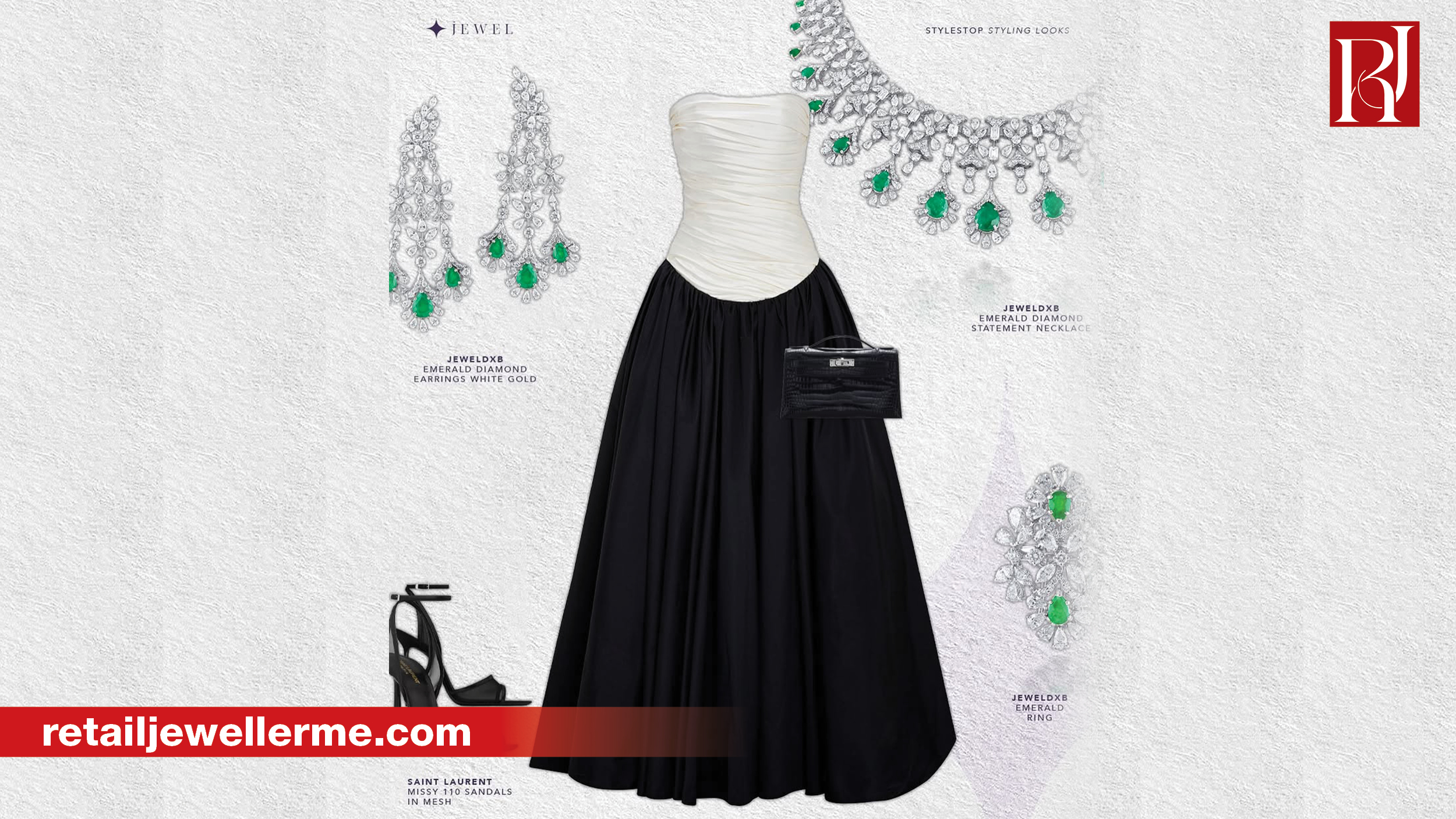 Dubai: Jewel DXB and StyleStop concluded their nine‑look collaboration in early June with a striking emerald and diamond statement necklace, matching earrings, and ring set in white gold. The finale pieces were styled alongside a Marmar Halim drop‑waist silk‑taffeta gown, Saint Laurent mesh Missy sandals, and a sleek Hermès Kelly pochette in black porosus crocodile. The final look maintained the project’s narrative — a series of bold gemstone and diamond presentations paired with high‑end couture and accessories — and marked the culmination of a cohesive editorial and exhibition effort.