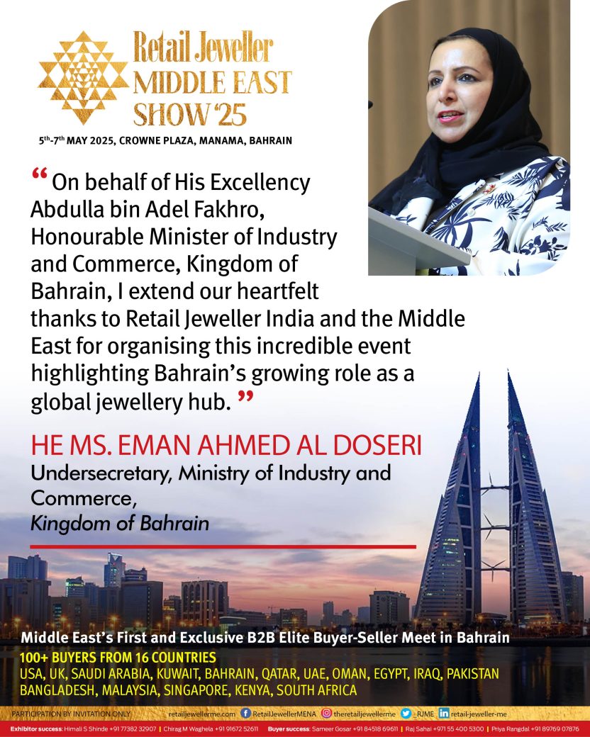 “On behalf of His Excellency Abdulla bin Adel Fakhro, Honourable Minister of Industry and Commerce, Kingdom of Bahrain, I extend our heartfelt thanks to Retail Jeweller India and the Middle East for organizing this incredible event highlighting Bahrain’s growing role as a global jewellery hub,” said HE Eman Ahmed Al Doseri.