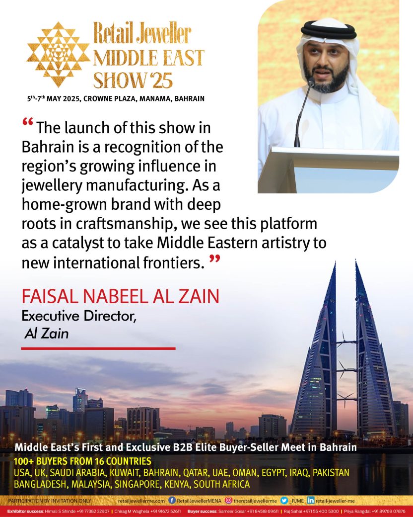 “The launch of this show in Bahrain is a recognition of the region’s growing influence in jewellery manufacturing,” said Faisal Nabeel Al Zain, Executive Director, Al Zain Jewellery. “As a home-grown brand with deep roots in craftsmanship, we see this platform as a catalyst to take Middle Eastern artistry to new international frontiers.”